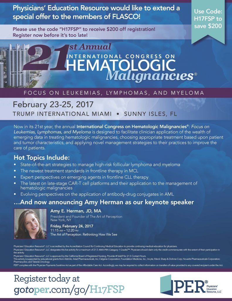 Now in its 21st year, the annual International Congress on Hematologic Malignancies®: Focus on Leukemias, Lymphomas, and Myeloma is designed to facilitate clinician application of the wealth of emerging data in treating hematologic malignancies, choosing appropriate treatment based upon patient and tumor characteristics, and applying novel management strategies to their practices to improve the care of patients. Use code H17FSP during registration for $200 off the registration fee.