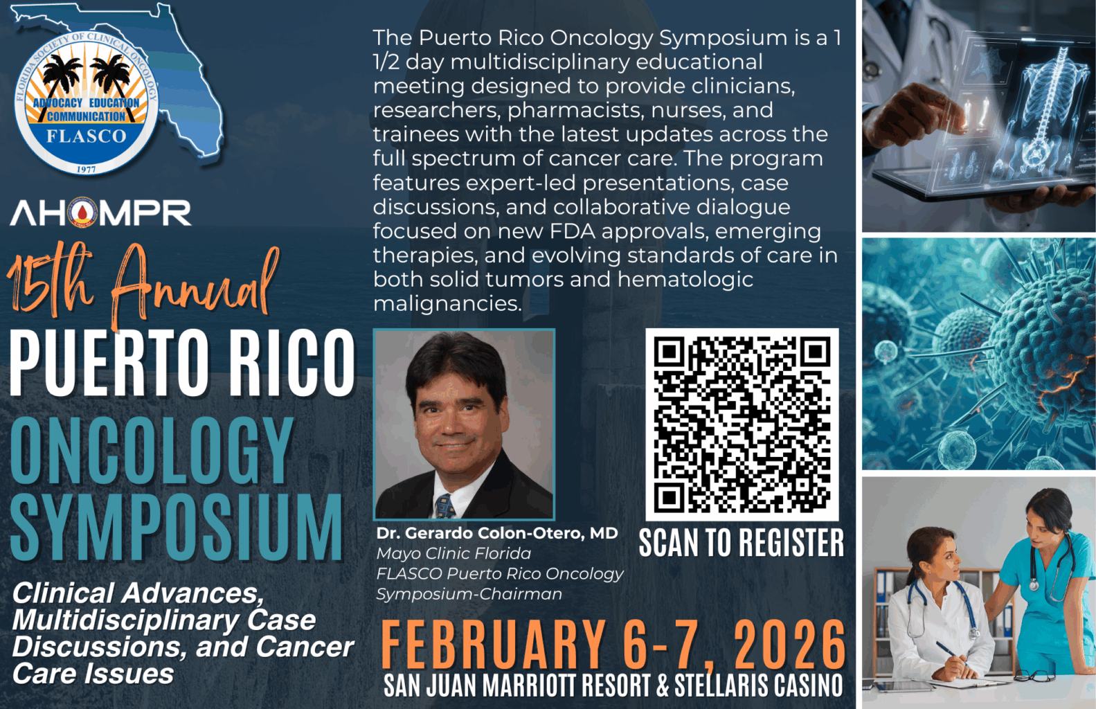The Florida Society of Clinical Oncology & Asociacion de Hematologia y Oncologia Medica de PR is hosting the 15th Annual Puerto Rico Oncology Symposium. This 1-1/2-day conference is designed to serve as a forum for networking and exchanging clinical and scientific advances among students, residents, fellows, and faculty involved in cancer care and cancer research in PR and mainland USA. The conference will provide practicing medical oncologists and cancer researchers with updates on treatments for selected cancers and recent research on cancer disparities, as well as the opportunity to share best practices and collaborate on improving patient outcomes.